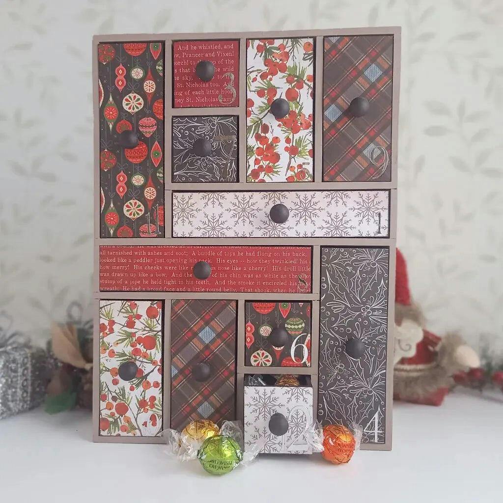 Expertly hand painted in brown and black, and decorated with Tim Holtz designer papers, this 12 day advent calendar chocolate holder adds a warm, classic touch to any festive décor. Perfect for both children and adults, it’s a thoughtful way to make the countdown to Christmas even more magical.