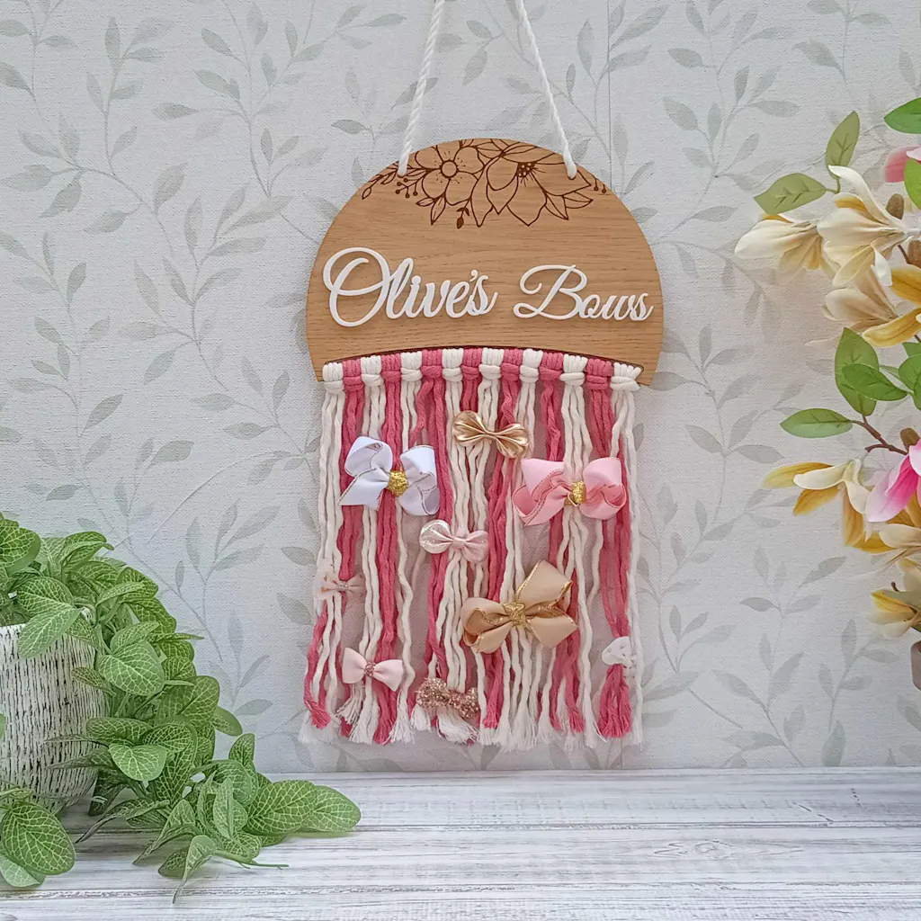 Keep your little one’s accessories beautifully organised with our handcrafted Wall Hanging Hair Bow Holder. This charming Personalised Bow Holder is the perfect addition to any girl’s bedroom or nursery both practical and stylish, it helps you store and display hair bows, clips, and headbands with ease.